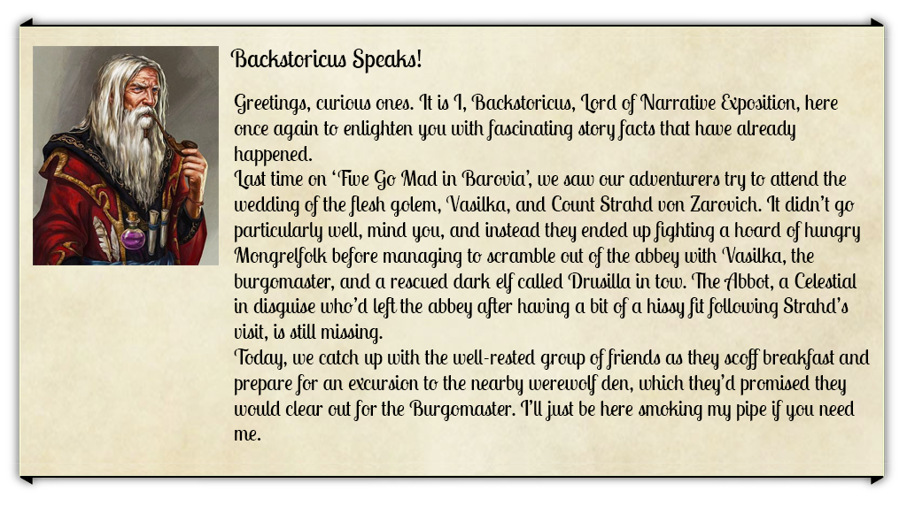 They find Anna Krezkov, the burgomaster’s wife, in the garden with Vasilka, teaching the flesh golem to plant carrots. She says that there’s a man called Radu in town who has boasted about knowing the location of the den but, after finding him, the adventurers discover that he’s nothing but a blowhard. He puffs out his chest and tells them that he was an integral part of a hunting party led by Torrell, but it quickly becomes clear that he’s more of a coward than a hero.