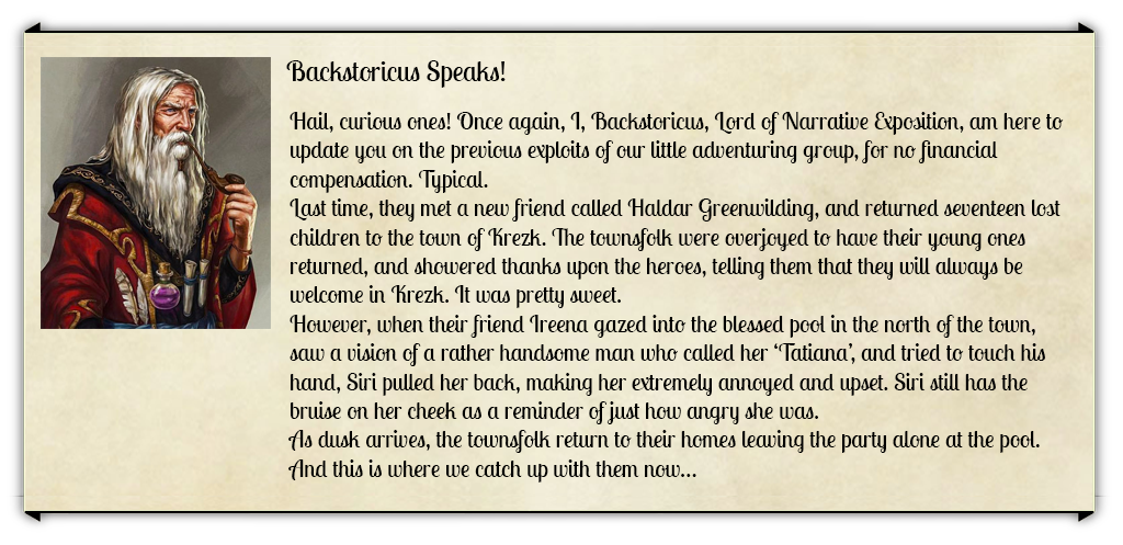 The group walk back down the path, wondering how they will spend their evening before turning in. Thia goes to the burgomaster’s house to spend some time with her children. Obryn returns to the peacefulness of the pool to clean and maintain his weapons. Siri and Haldar take a walk up the hill towards the Abbey, where they sit and chat about Krezk, the wedding, and the strange book that the paladin took from the Abbot’s chambers. But Devlin, well, he has other plans.