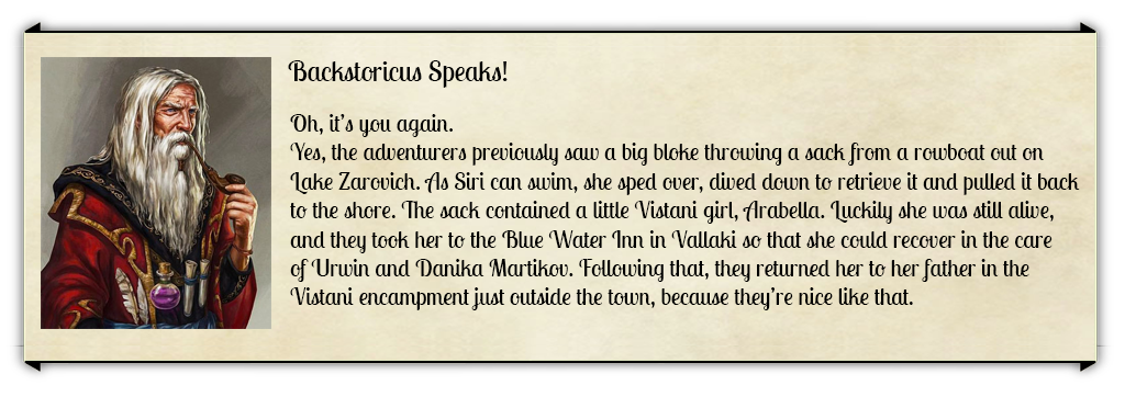 The next morning, at breakfast, the group discuss their options and decide that it’s time to visit Argynvostholt to sort out the revenants, on the promise that the next place they visit is Vallaki so that Obryn can confront Isek, and Devlin can kill the burgomaster and take over the town.