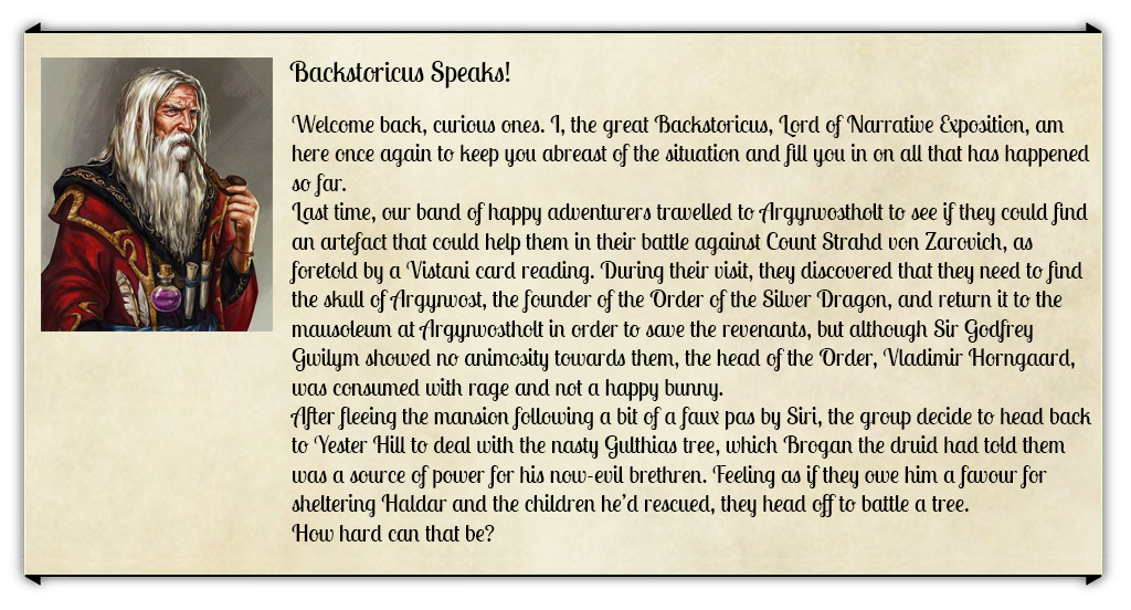 Getting the skull back to Argynvostholt isn’t such an easy task. It’s massive, so they construct a kind of sled from the slimy remains of the Gulthias tree and attach it with rope to Lightning, the undead elk. Devlin levitates the skull and lowers it carefully onto the sled, and they’re ready to go. It takes a while for Lightning to acclimatise to the weight he’s pulling and the makeshift platform nearly tilts a few times, but he’s a strong lad and he soon gets the hang on it. By the time evening falls, they can see the vineyards of the Wizard of the Wines on their left so, not wanting to bother the Martikovs, they camp down in a clearing in the middle of a small wood, not far from the main house.