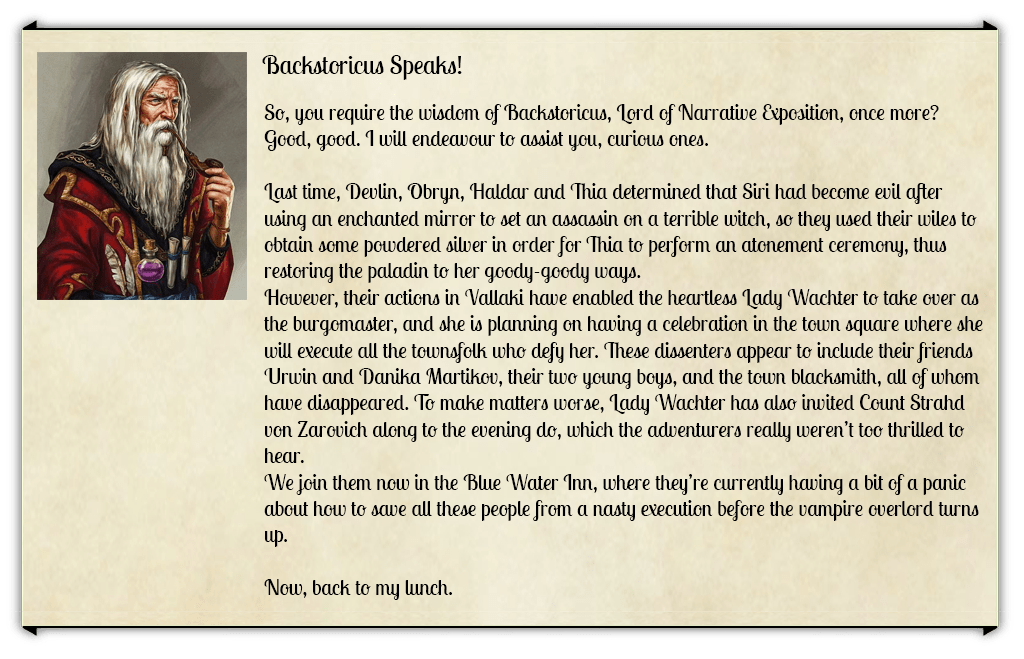 “The Keepers of the Feather have been kept a secret for far too long,” he says. “We will now run Vallaki, with Baron Vallakovich as the Burgomaster in name only, and take more of a hand in keeping the town safe and secure from now on.”