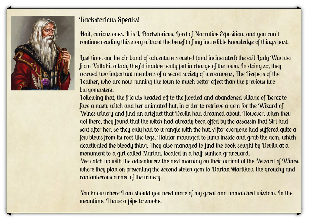 The ride through the early morning mists down to the winery is thankfully uneventful, and the group arrive there in good spirits, happy that they’ll be helping the place to produce better wines again. They’re met at the front door by Darian Martikov, who favours them with one of his best scowls.