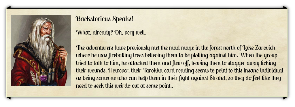 Packing up their kit, the adventurers head off into the forest to look for the mad mage. Keeping to their plan, they try to remain stealthy while looking for tracks or any other indications that he’s in the area but, after two hours, all they find are two trees that look as if they were burned quite a while ago. Suddenly, they hear an explosion in the distance and, peeking out from the trees, they spot the mage flinging fireballs into the lake. The trouble is that he sees them too, and darts back into the forest.