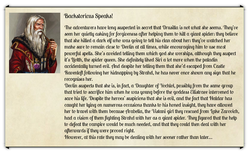 “Then we must take the power from Strahd by destroying this thing!” she cries. “Only then will we be able to vanquish him!”