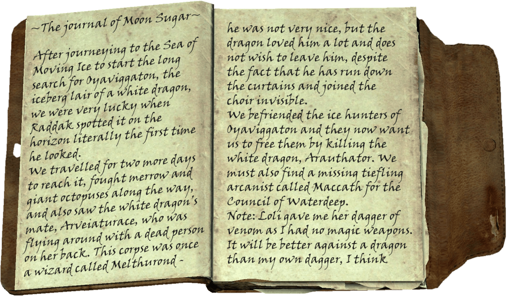 Getting back to the hole they entered the cavern through, Loli casts Fly on Moon, Yaseino and Mirik and Levitate on herself, while Raddak unfolds his wings, and all of them ascend safely back up to the Scriptorium. Maccath is delighted at their return, especially when she realises that they have all the books she requested.