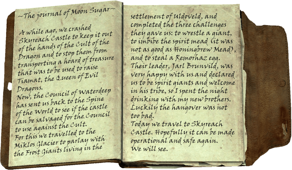 Riding on the head and shoulders of Gary, a Frost Giant who took pity on them for being unable to keep up with the rest of the giants, the adventurers soon see Skyreach Castle in the distance, resting at an angle to the snow-covered surface of the glacier. On the way there, Gary explains to them that Jarl Brunvild is concerned by the presence of the Cult of the Dragon around the castle, which is why he has decreed that the giants will go there to fix both the steering tower and the levitation magic that keeps the castle aloft. They also want to make sure that the Cult do not gain control of it, as giants and dragons are no allies to each other.