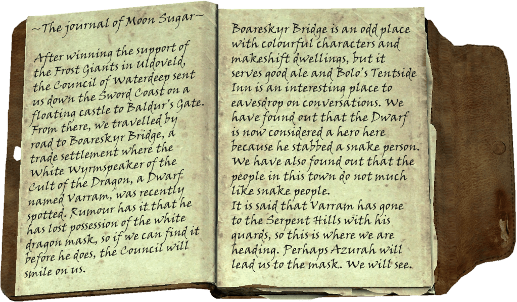 For two days, Loli, Mirik, Raddak, Yaseino and Moon follow the path north along the river, then veer off towards the lush forests of the Serpent Hills. On the third day, they find an ancient shrine consisting of an obelisk surrounded by huge upright snake fangs, but when Moon stealths up to inspect it, she also sees humanoid skeletons artistically arranged in a circle around the central stone. However, as she can’t read any of the symbols that are carved into the obelisk, and because Raddak senses no magic from the shrine, they decide that it’s probably best left alone.