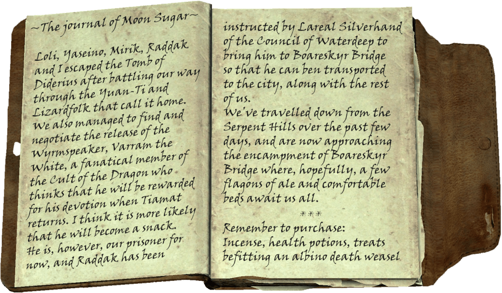 Loli then stands and details the events that led the group to Boareskyr Bridge, the Tomb of Diderius, and ultimately the capture of Varram, the White Wyrmspeaker.